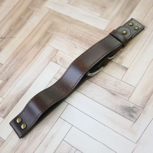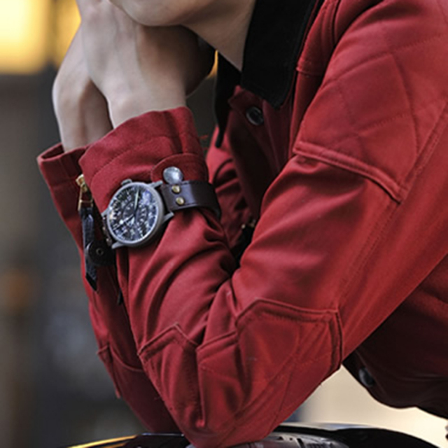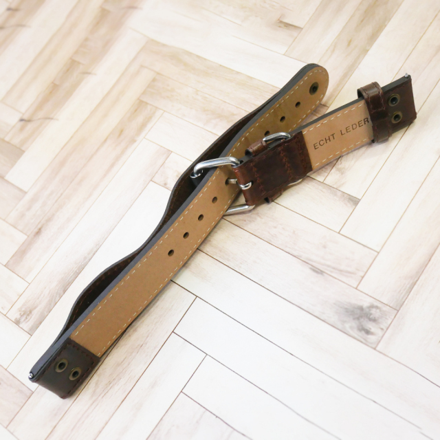 こちらのパイロットストラップは22mm幅です。時計本体のベルト幅をご確認の上、お買い求めください。素材は天然カーフスキンを使用し、皮革独特のアンティーク調の仕上がりです。なお、ジャケットの上から装着することを想定した腕回りサイズとなります。